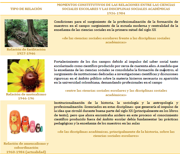 Esto derivó en la especialización gradual de las disciplinas sociales, lo que conllevó la aparición de problemas y categorías novedosas de estudio, al igual que el desplazamiento hacia orientaciones metodológicas y teóricas diversas que produjeron una especie de extrañamiento u olvido de la matriz que les dio origen: la enseñanza. De acuerdo con esto, como último hallazgo podrían mostrarse tres grandes momentos en las relaciones entre las ciencias sociales escolares y las disciplinas sociales académicas en el periodo de estudio: una relación de facilitación (1920-1946) "de las ciencias sociales escolares frente a las disciplinas sociales académicas"; una relación de mutualismo (1946 a 1960) "entre las ciencias sociales escolares y las disciplinas sociales académicas"; una relación de subordinación y de alelopatía (desde mediados de 1960 hasta nuestros días) "de las disciplinas académicas, principalmente de la historia, sobre las ciencias sociales escolares", cuyas características se detallan en el cuadro 1.