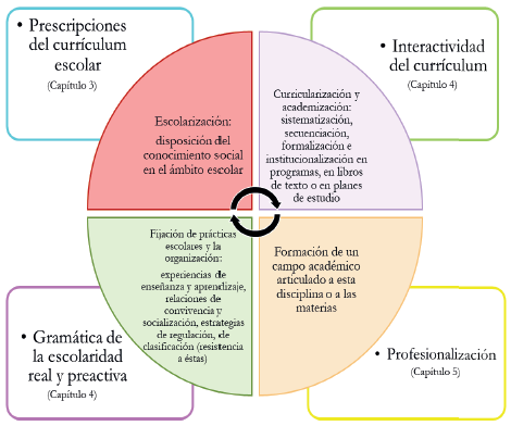 Por tanto, se focalizó la pesquisa en el currículo prescriptivo, concebido como aquellas formulas y preceptos emanados principalmente desde la macro-política, al igual que desde los textos visibles de la enseñanza (programas, exámenes, libros de texto), esto es, las regulaciones frente a la disposición del conocimiento social en la escuela, lo cual va a desencadenar en la escolarización. Asimismo, en el currículo interactivo que da cuenta de la curricularización y academización de dicho conocimiento en diversos dispositivos de enseñanza -libros, cartillas, planes de estudio, mallas curriculares- y de la apropiación/invención de estos procesos por parte de las y los maestros (prácticas, normas, concepciones y cotidianidad de las escuelas). Por otro lado, en la gramática de la escolaridad (organización escolar) preactiva (disposiciones externas) y la real (que se materializa en la cotidianidad escolar), que muestra la fijación de prácticas escolares y su operativización mediante la organización del tiempo y el espacio escolar, experiencias educativas, relaciones convivenciales y de socialización. Finalmente, en la formación de un campo académico articulado a las disciplinas sociales que llevó a la profesionalización de estas para el decenio de 1960 y en una mirada inicial a los usos profesionales.