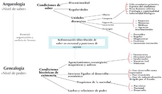 Para la descripción de las modalidades enunciativas se procura reconocer las regularidades que otorgan estatuto a quien o quienes son aceptados para pronunciar un discurso y precisar enunciados particulares al respecto y en qué condiciones, apartándose de la figura del sujeto psicológico, para centrarse en las posiciones que ocupa un sujeto en el orden del discurso. Para la descripción de los conceptos no se limita a las relaciones lógicas o sintácticas entre frases o preposiciones; de ahí que la arqueología no debe ser equiparada con un análisis del discurso convencional. La descripción de estrategias discursivas implica, entre otras cosas ya señaladas, el análisis de la función del discurso frente a las prácticas no discursivas. En la Figura 2 se muestra la manera como se adecuaron los principios de este enfoque al estudio emprendido:
