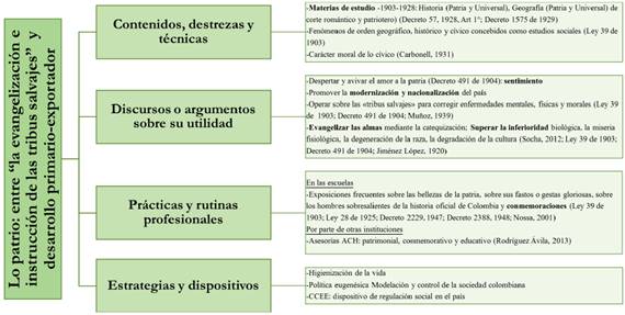 En este marco, se evidenciaron tres propósitos centrales en la constitución del campo educativo, en especial de las ciencias sociales escolares, desde las prescripciones al currículo. Desde finales de 1800 hasta 1927, la configuración de lo patrio, que se inscribió en el modo de instrucción civilizatorio, el cual, de acuerdo con la propuesta de Orlando Silva Briceño (2018), consistió en la evangelización e instrucción de la población para lograr la civilización de las llamadas "tribus salvajes" y el progreso del país a partir de artificios como la adhesión a la Patria desde la generación de un sentimiento. Para ese momento las ciencias sociales escolares fueron distribuidas en materias de estudio divididas en Historia y Geografía patrias (junto con la Instrucción Cívica en la primaria), cuyos contenidos se demarcarían por los cánones establecidos para la enseñanza por instituciones como la Academia Colombiana de Historia (Rodríguez Ávila, 2013).