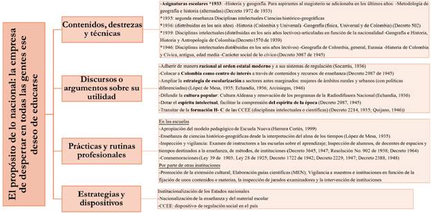 Desde 1927 hasta mediados de 1960 se apreciaría la consolidación del propósito de la nacionalidad que se inscribió en la transición entre el modo de instrucción civilizatorio y la consolidación del desarrollista, en el que se proyectó la adhesión racional de la población al orden estatal moderno, así como a sus aparatos de gobierno, al impulsar "la empresa de despertar en todas las gentes ese deseo de educarse" (Echandía, 1936). Los planes de estudio muestran que la disposición de las ciencias sociales escolares obedeció a una agrupación precedente (de lo que decenios más tarde sería la integración curricular), inicialmente como ciencias histórico-geográficas, las cuales pertenecían a las disciplinas intelectuales, cuyo fin radicaba en la comprensión y resolución de problemáticas que agobiaban a la nación, en rechazo de la enseñanza memorística para, en cambio, promover el pensamiento científico y la actividad razonadora (Decreto 1972 de 1933; Decreto 502 de 1936; Decreto 1570 de 1939; Decreto 3087 de 1945). Otras fuentes también permiten que circule este pensamiento y se consolide la nacionalidad, al menos al nivel prescriptivo, del currículum (Arciniegas, 1946; Decreto 2214 de 1935; Echandía, 1936; López de Mesa, 1935; Quijano, 1946; Socarrás, 1936).
