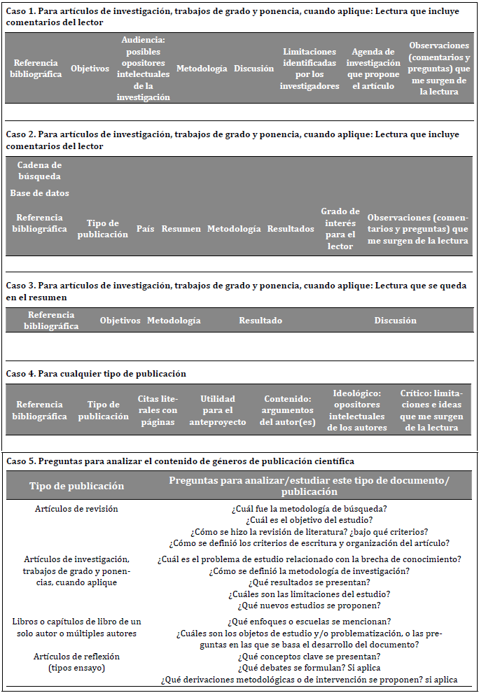 Figura 2 Ejemplos de tablas que apoyan el registro de información y el estudio de los documentos, que incluyen diversos comportamientos del lector
