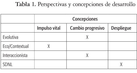 Las perspectivas que estudian la emergencia y transformación de las expresiones afectivas durante el primer año de vida transitan en una matriz desarrollista con diferentes concepciones del cambio. Las tres modalidades de cambio en el desarrollo de Van Geert (2003): impulso vital, cambio progresivo y despliegue, nos permite afirmar que en la perspectiva que aborda el desarrollo como Impulso vital, la teoría de U. Brofrenbrenner en el marco perspectiva ecológico-contextual explica perfectamente el vínculo entre el cambio interno del sistema y su dependencia de las fuentes de cambio externo que proveen los contextos de interacción (ver tabla 1).