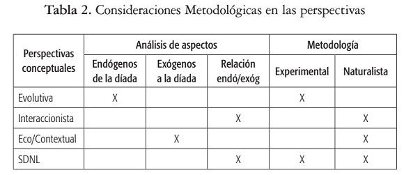 La perspectiva interaccionista asume las prácticas culturales específicas de cada diada como escenarios privilegiados para la observación de la organización diádica. Las unidades de análisis reconocen las transacciones entre aspectos endógenos y exógenos. El análisis de diadas (madre-bebé) y tríadas (madre - bebé - objetos) privilegian el abordaje de habilidades cognitivas/ comunicativas del niño pequeño en contextos de juego social.