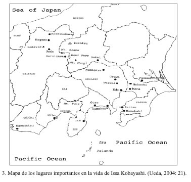 La vida trató duramente a Issa Kobayashi (figura 2). Si bien se le conoce como uno de los poetas del más fino humor dentro del haikai,14 su vida no es precisamente el argumento para una comedia. La historia comienza en la población de Kashiwabara (noroccidente de Tokio) que era famosa por las enormes cantidades de nieve y las extremas bajas temperaturas durante el invierno. En este ambiente hostil y frío, Yagobei, un campesino propietario de dos acres de tierra poco productivas, contrae matrimonio con Kuni Miyazawa. De esta unión nacería, el 5 de mayo de 1763, Kobayashi Nobuyuki, también llamado Yatarô, el primogénito. El pequeño queda huérfano a los dos años, por lo que su cuidado sería responsabilidad de su abuela Kana. En 1770, cinco años después de la muerte de la madre de Yatarô, Yagobei se vuelve a casar, esta vez con Hatsu, quien nunca tuvo buenos afectos hacia el niño. Esta situación empeora cuando nace el primer hijo del matrimonio, Senroku.