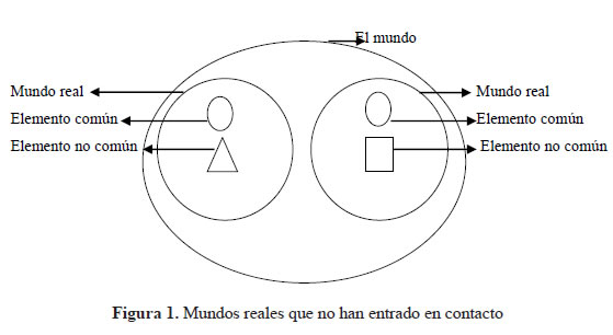 En la Figura 1 se muestran aquellos mundos reales que a su vez hacen parte del mundo y que no han entrado en contacto. El mundo inclusivo, como es concebido por Lewis, abarca todos los elementos que conforman el mundo, tanto los conocidos como los desconocidos. A su vez, el conocimiento que las comunidades lingüísticas tienen sobre esos elementos está condicionado por la experiencia con estos, es así como los diferentes mundos reales tienen, a su vez, elementos que son comunes entre ellos y otros que no lo son.