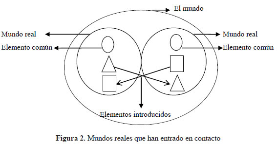En la Figura 2 se muestran los mundos reales que han entrado en contacto. Hay elementos previos al contacto que son comunes y otros no comunes que se introducen luego del contacto. Los elementos introducidos son aquellos que anterior al contacto no hacían parte de otro mundo real, pero que se adquieren por el hecho de haber tenido la experiencia con esa nueva realidad por lo que se vuelven parte de otro mundo real, así como lo menciona Bloomfield (1961: 445): ''objects, both natural and manufactured, pass from one community to the other, and so do patterns of action, such as technical procedures, warlike practices, religious rites, or fashions of individual conduct''. Es preciso indicar que a veces los elementos introducidos no se dan de manera recíproca por lo que se presentan en una sola dirección. Para Bloomfield (ibid.: 461) esta unidireccionalidad tiene relación con que tanto tenga una comunidad para dar en relación con la otra: ''it is one-sided only to the extent that one nation has more to give than the other''.
