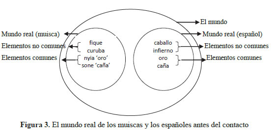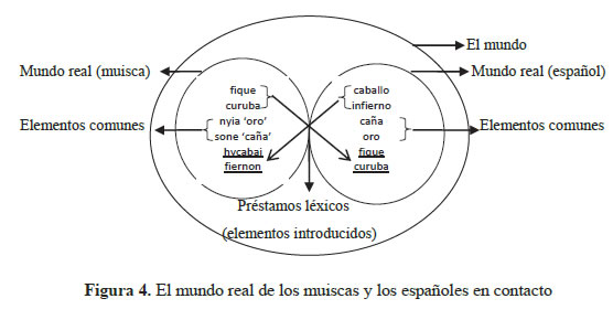 La Figura 3 representa, a la izquierda, el mundo real muisca y, a la derecha, el mundo real español antes de entrar en contacto. Ambos mundos reales, que a su vez hacen parte del mundo, tenían algunos elementos que eran comunes, pero cada uno tenía una denominación para esos elementos comunes como en el caso de sone y caña y nyia y oro. Había otros elementos que no eran comunes como fique y curuba, por un lado, y caballo e infierno, por el otro. La Figura 4 representa el mundo real muisca y el mundo real español en contacto, en donde se puede evidenciar los préstamos léxicos en el mundo real. Cuando un préstamo léxico tienen lugar, estos sufren una adaptación a la lengua receptora por eso, en el caso del muisca se presenta hycabai 'caballo' y fiernon 'infierno'. En el caso del español se presentan los préstamos fique7 y curuba8 sin ningún tipo de adaptación.