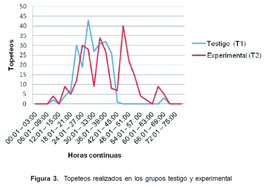Los topeteos realizados para T1 fueronde 18,7 ± 8,8 veces por animal y para T2 fueron de 23,8 ± 23,4 veces por animal (Figura 3). La conducta de topeteos fue la que más temprano se presentó, iniciándose en T1 a las 9 h después de retirar los implantes y se extendió hasta las 45h. La mayor actividad se presentó entre las 21h y las 42 h, coincidiendo con la mayor presentación de celos, la cual se presentó entre las 28 y 30 horas post-retiro de los implantes. Para T2 los topeteos también se iniciaron a las 9 h post-retiro de los implantes y se prolongaron hasta las 54 h (12 h más que en T1). Al igual que en T1, también coincidió esta actividad con la mayor presentación de celos, que para este grupo fue desde las 33 h hasta las 40 h post-retiro de los implantes. Se observó en ambos grupos que esta conducta de topeteos se incrementó alrededor de la presentación del estro.