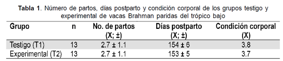 Los criterios de inclusión para los grupos de estudio se muestran en la tabla 1. Se observa que el número de partos, días postparto y condición corporal fueron similares para los dos grupos.