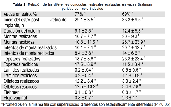 We evaluated the sexual behavior of 26 Brahman cows pharmacologically induced to the estrus. Two treatment groups of 13 animals were formed and randomly assigning each group the following treatments: Treatment 1 (T1): Day zero: subcutaneous implant on the outside of the ear with 3 mg of norgestomet plus muscular injection of 3 mg of norgestomet and 5 mg of estradiol valerate. Day seventh: muscular injection of 0,15 mg of (D+) cloprostenol. Day ninth: it was removed the implant and temporary interruption of suckling of the calves for 48 hours through the separation of mother and calf. Treatment 2 (T2): Same as described in T1, but after we removed the implant, it was introduced a subgroup of four cows previously induced by estrus. Estrus, duration of estrus, made mounts, received mounts, made butting, made smelling, received smelling, genital licking, flehmen, urination, defecation and vaginal discharge were recorded. The average interval between implant removal and onset of estrus was 29 ± 4 and 36 ± 4 hours for T1 and T2 respectively (P>0.05). The average of mounts done was of 11 ± 8 and 20 ± 9 for the T1 and T2 (P<0.05). The average of received mounts was of 26 + 24 and 11 ±11 (P>0.05) for the T1 and T2. The average of received smelling was of 13 ± 10 y 3.4 ± 2.8 (P>0.05) for the T1 and T2. No statistical differences were found in the rest of sexual behavior evaluated in this study (P>0.05). We conclude that the introduction of a subgroup of cows in estrus at the time of implant removal in a group of cows synchronized, significantly affect the made mounts and received smelling, but did not affect the presentation or the duration of estrus.