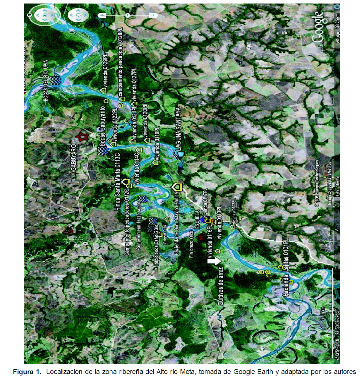 El área de estudio comprende la ribera del rio Meta en los municipios de Cabuyaro y Puerto López, tomada desde la desembocadura del rio Humea, a 4º 9' 49" Norte y 72º 55' 39" Oeste a 185 msnm y 4º 18' 30.41" Norte y 72º 44' 14.36", hasta la desembocadura del río Upía Oeste a 163 msnm, cuya zona presenta un clima cálido, con alta precipitación pluvial en los meses de abril a julio y una temperatura entre 26 y 27ºC. (Figura 1).