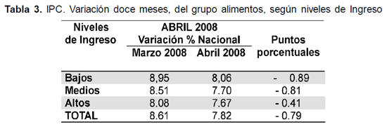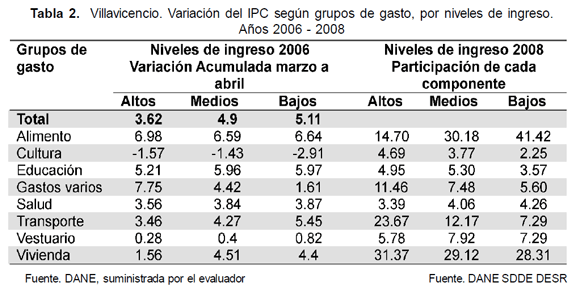 En tal sentido, los grupos poblacionales de ingresos bajos, siempre serán los más afectados y la brecha de pobreza mayor pues la variación nacional en el nivel de precios fue de 1.28 % para el 2008, y las ciudades con mayores variaciones mensuales Pasto con 2,75 % y Villavicencio con 1,49 %, así los resultados acumulados en alimentos representaron el 7,32 %, aunque menor del año 2007 que fue de 8,1 %, resulta muy alta para quienes viven más aislados que responden a ingresos bajos de la tabla 3, y así cada vez tendrán menos para destinar a necesidades diferentes a alimento.