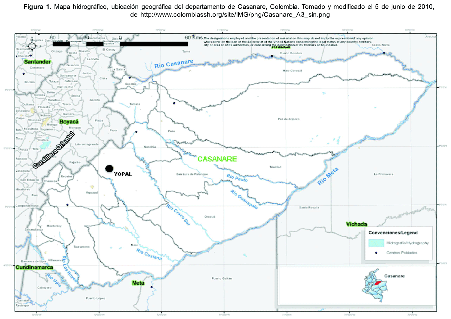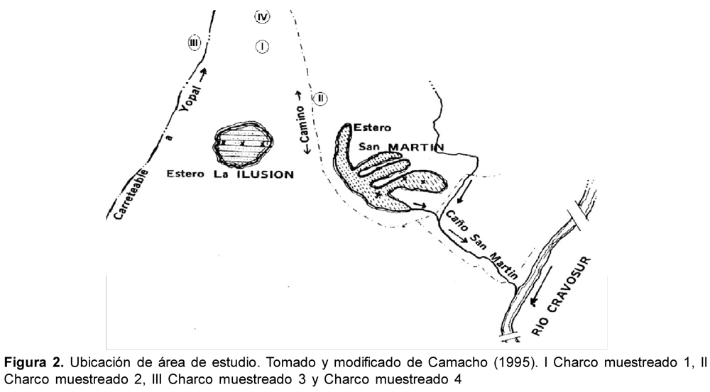 Área de estudio: los cuerpos de agua estudiados se localizan en jurisdicción del municipio de Yopal, en la vereda Tacarimena a 25 kilómetros del casco urbano, en la finca La Moravia (05° 21' 31''N 072° 13' 16''W, 214 msnm) sobre la margen derecha del Río Cravo Sur, afluente del río Meta (Figuras 1 y 2). Los dos esteros son naturales y se localizan en áreas definidas en el tiempo, en tanto que los charcos temporarios fueron seleccionados al azar. El estero San Martín aloja volúmenes de agua con una permanencia de 10 a 11 meses al año y tiene una extensión de 4 hectáreas (Camacho, 1995), el cual en la época de altas lluvias drena al caño San Martín y en épocas de inundaciones es subsidiado por éste y por el Río Cravo Sur, alcanzando una profundidad máxima de 1,50 mts. Este está cubierto por vegetación herbácea enraizada emergente y flotante que desaparece en época de sequía. El estero la Ilusión, es un cuerpo de agua semipermanente, con una extensión aproximada de 1.0 a 1.2 hectáreas, y localizado al sur del estero San Martín, a una distancia aproximada de un kilómetro con ubicación geográfica de 05° 21' 14.89''N 072° 13' 19.78''O. El volumen y el nivel de agua almacenado, dependen de las precipitaciones locales, el nivel freático y las inundaciones de sabana, por no presentar comunicación superficial con otros cuerpos de agua. Alcanza una profundidad máxima de 0.8 metros. Este ecosistema tiene una permanencia de 8,5 a 9 meses al año, con vegetación herbácea enraizada emergente y flotante que desaparece en época de sequía. Está bordeado de vegetación de sabana. Los cuatro charcos temporales (Figura 2) se seleccionaron en sabana abierta, con alta intervención de pastoreo y actividades agrícolas.