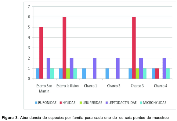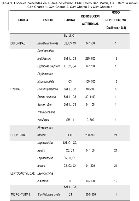 En la familia Hylidae las ranas del género Scinax registra 2 especies, seguido Dendropsophus, Hypsiboas, Phyllomedusa, Pseudis y Trachycephalus con un representante cada uno. Por otra parte la familia Leptodactylidae está representada exclusivamente por 3 especies del género Leptodactylus (Tabla 1). Lo anterior es coincidente con lo propuesto por Duellman (1988) y Suárez- Mayorga (1999) quienes concluyen que en tierras bajas, por debajo de los 1000 msnm son más abundantes dichas familias.