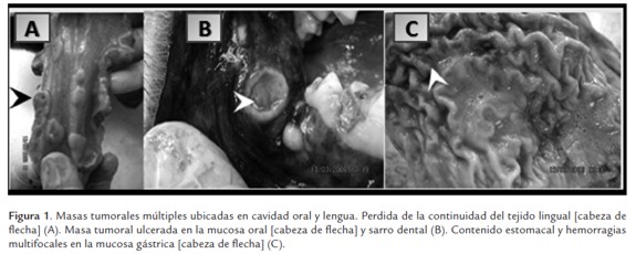 Los principales hallazgos a la inspección externa fueron: masas nodulares multifocales, tumefactas y ulceradas de 1 cm diámetro en cavidad oral (ver figura 1A), pérdida del tejido lingual (ver figura 1A), halitosis y presencia de sarro dental (ver figura 1A). Edema y hemorragia petequial en epiglotis, así como presencia de secreción mucopurulenta en la glotis. Los pulmones se encontraron pálidos con zonas de atelectasia y masas nodulares multifocales de un centímetro de diámetro, se evidencio congestión en bordes lobulares. En estómago se presentaron hemorragias en la mucosa y secreción mucoserosa de color verde claro (ver figura 1C). El hígado se hallo muy congestionado, de color marrón oscuro y con apariencia marmorizada y escasas masas nodulares de un centímetro de diámetro. El corazón presento dilatación de las cuatro cámaras con ganglios linfáticos mediastínicos de coloración negra. En el bazo se presento congestión y con superficie rugosa capsular. Se encontró enterorragia y mucosa intestinal hiperémica. Los riñones estaban muy congestionados y tumefactos. Los ovarios estaban de color pálido y hubo presencia de un cuerpo lúteo en el ovario derecho. En la vagina se halló una secreción amarillo verdosa fétida. En el útero se encontraron dos fetos en proceso de autolisis.