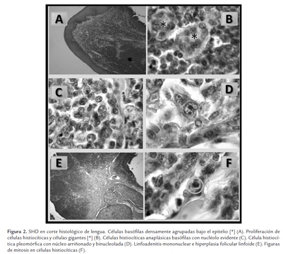 Microscópicamente se diagnosticó el SHD en el tejido lingual por la observación de áreas compuestas por células histiociticas pleomórficas de ovales a poligonales, algunas con núcleos ovoides a reniformes con mono o binucleolos bien evidentes, así como abundante citoplasma eosinofílico con o sin vacuolas. Adicionalmente se observó la presencia de tejido conjuntivo como soporte celular así como numerosas células binucleadas y multinucleadas con citoplasma escaso y de 5 a 6 figuras mitóticas por campo. La descripción histopatológica de este reporte concuerda con las características histológicas del histiocitosis maligna descritas por Carlyle et al (1997), Valli et al (2002), Willard y Tvedten (2004), Azakami et al (2006) y Trost et al (2008), (Constantino-Casas et al, 2011).