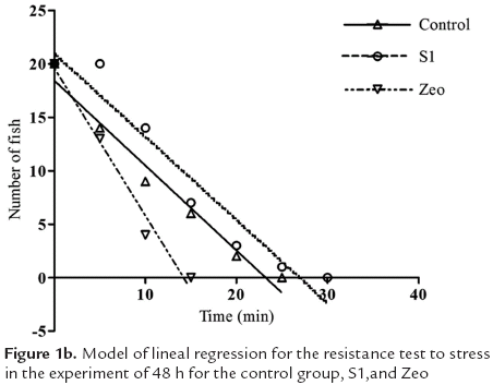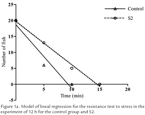 Resistance test to conditions of hyperosmolarity The linear regression model between the number of fish that kept their swimming axis(y) and the time of exposure to the saline solution showed an inverse relationship (P<0.0001) for the two confinement times (Figure 1a).