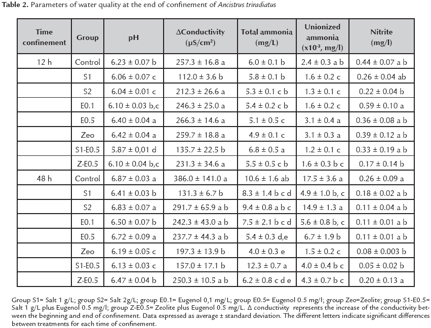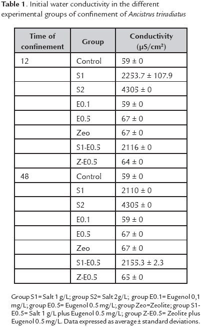 Evaluation of the use of sodium chloride, eugenol, and zeolite in confinement of Ancistrus triradiatus