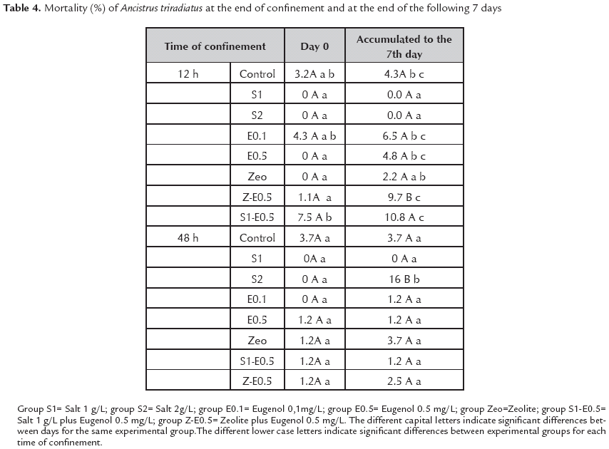The absence of mortality in groups exposed to 1 and 2 g/L NaCl in the 12 h experiment and S1 group in the experiment of 48h shows the beneficial effects of sodium chloride by reducing the osmotic gradient between the water and blood, alleviating the stress, and increasing resistance to conditions of hyperosmolarity. The absence of mortality in these groups is notable because it avoids deterioration of water quality caused by dead fish. The 16% mortality registered for the S2 group in the experiment of 48h the following 7 days after finishing the confinement period indicates that the concentration of 2 g/L of salt is not suitable for prolonged exposure in the confinement of A. triradiatus. Gomes et al. (1999, 2006) reported that exposure of jundiá to 6 g/L of salt, and tambaqui to 1, 2, and 3 g/L, caused mortality after 12h and 24h, respectively. Gomes et al. (2006) also reported that exposure of pirarucú to concentrations between 1 and 5 g/L induced osmoregulatory disturbances and did not alleviate the stress during transport. Similarly, Pavlidis et al. (2003) did not report beneficial effects from the addition of salt on the survival of red porgy, Pagrus pagrus. The significant increase in mortality after 7 days in the group exposed to 2 g/L of salt agrees with the recommendation of Lim et al. (2003) to monitor mortality up to 7 days after transport due to the effects of stress in the medium term. There was not a beneficial effect of eugenol and the mixtures S1-E0.5 and Z-E0.5 on fish survival.