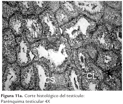 Los testículos están conformados por los túbulos seminíferos (Ts), en su lámina basal se encuentran las espermatogonias (Eg) que se van acercando a la luz hasta encontrar los espermatocitos (Es), ubicados en la capa germinal y adyacente a estas las células de Sertoli (Cs), estos túbulos están circundados por poco tejido conectivo y en su intersticio de ubican las células de Leyding (CL), el testículo está recubierto por una túnica albugínea (Figura 11a, b). La relación porcentual alométrica de los testículos se observan en la tabla 6.