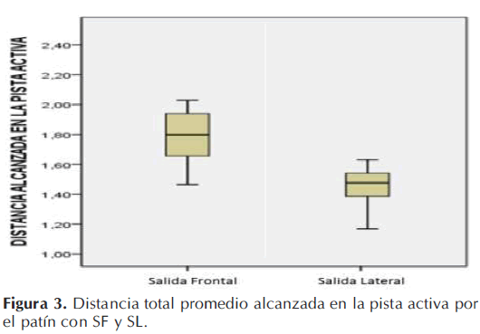 La figura 3 presenta con respecto a la (DIST ACTIVA) Distancia total promedio alcanzada en la pista activa por el patín, una diferencia significativa a favor de la SF sobre la SL. En términos de la prueba de hipótesis, se aprueba la hipótesis nula y se rechaza la hipótesis alternativa, lo cual hace aceptar que la SF produce resultados que son efectivos para obtener mayor velocidad total promedio (del TI), mayor aceleración total promedio (del TI) y mayor distancia total promedio alcanzada en la pista activa por el patín, para las pruebas CRI en patinaje de VSR.