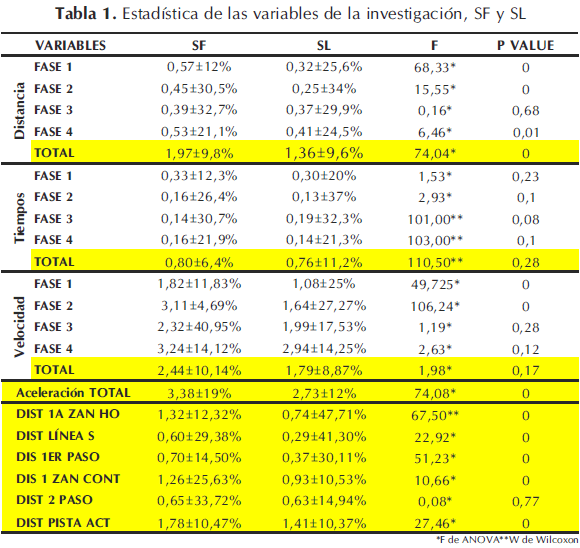 En la figura 1, se evidencia que la velocidad total promedio (del TI), presenta una diferencia significativa a favor de la SF sobre la SL.