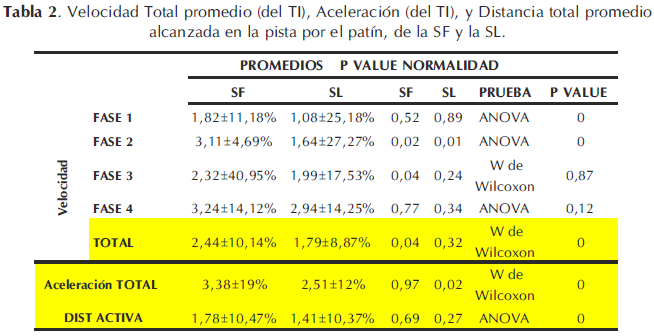 Para determinar la efectividad de la SF y la SL para la prueba 300 m Pista CRI en patinaje de VSR se analizaron los resultados de las variables Velocidad Total promedio (del TI), Aceleración (del TI), y Distancia total promedio alcanzada en la pista activa por el patín, con la prueba de diferencia de promedios al 95% de confianza.