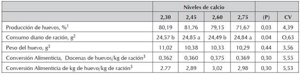 La producción de huevos se incrementó de forma cuadrática (P=0,03) con dietas hasta con 2,45% de calcio y el consumo de ración se incrementó (P=0,04) con los niveles 2,45 y 2,75% de calcio. Sobre la conversión alimenticia de kg de ración/docenas de huevos, el peso del huevo y la conversión de kg de ración/kg de huevo no hubo efecto (P>0,05) de los niveles de calcio.