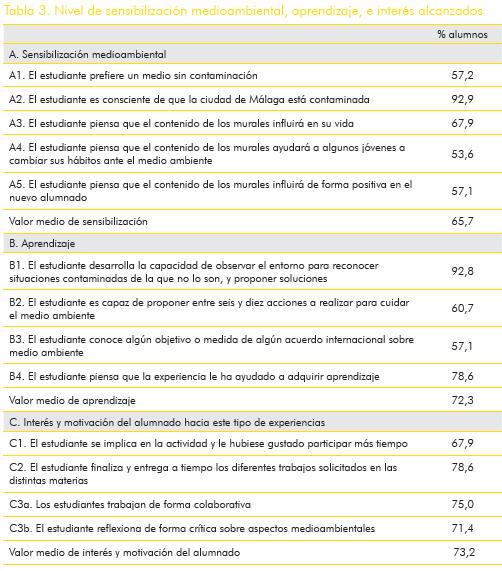 Para conocer si la experiencia había cubierto el objetivo principal previsto y había conseguido sensibilizar al alumnado durante su desarrollo, o lo haría posteriormente con la exposición de los materiales elaborados, se plantearon cinco indicadores: A1) Preferencia del estudiante hacia un medio limpio o contaminado, A2) desarrollo de su capacidad de reflexión sobre el grado de contaminación de su ciudad, A3) influencia del contenido de los murales en su vida diaria, A4) en el posible cambio de hábitos medioambientales de los estudiantes, y A5) en el nuevo alumnado.