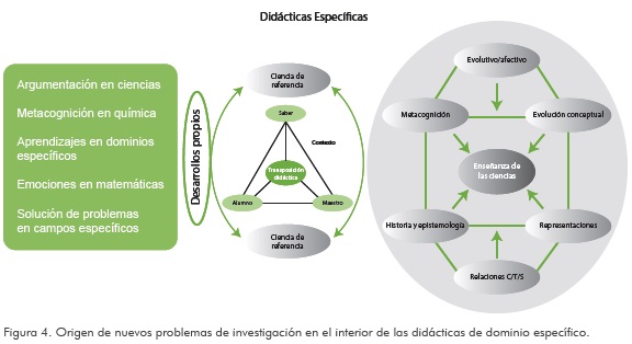 Los aportes de las didácticas específicas a la didáctica general y a la pedagogía parten del estudio de problemáticas específicas, tal es el caso de los recientes hallazgos de la argumentación en ciencias, los procesos de autorregulación en el aprendizaje de la lectura, el empleo de las múltiples representaciones en la enseñanza y aprendizaje de las matemáticas, de los aportes de la visualización en el aprendizaje de la química, entre muchos otros (figura 3).