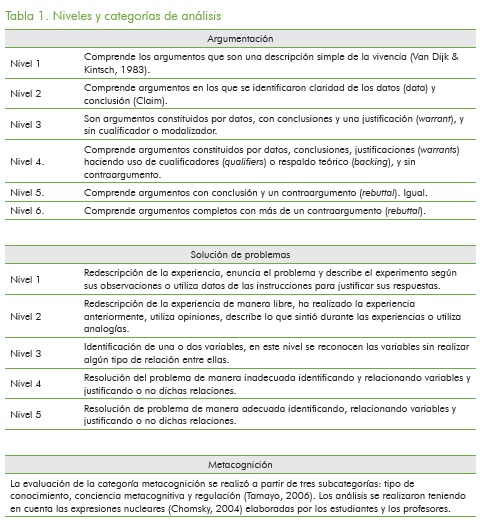 Las diferentes actividades de aula presentadas partían de un problema de ciencias, el cual debía ser resuelto experimentalmente o mediante el empleo de diferentes estrategias seleccionadas por los estudiantes. Los materiales requeridos para la realización de las actividades fueron suministrados por los investigadores, quienes previamente realizaron los procesos de validación y pilotaje de estas. Asimismo, adelantaron un proceso de formación docente a 77 profesores asistentes, los cuales se encargaron de realizar, en conjunto con los profesores titulares de las 56 instituciones educativas, las diferentes actividades propuestas orientadas a caracterizar el pensamiento crítico en estudiantes. En la tabla 1 describimos los niveles para evaluar la calidad de la argumentación, de la solución de problemas y las subcategorías utilizadas para evaluar la metacognición.