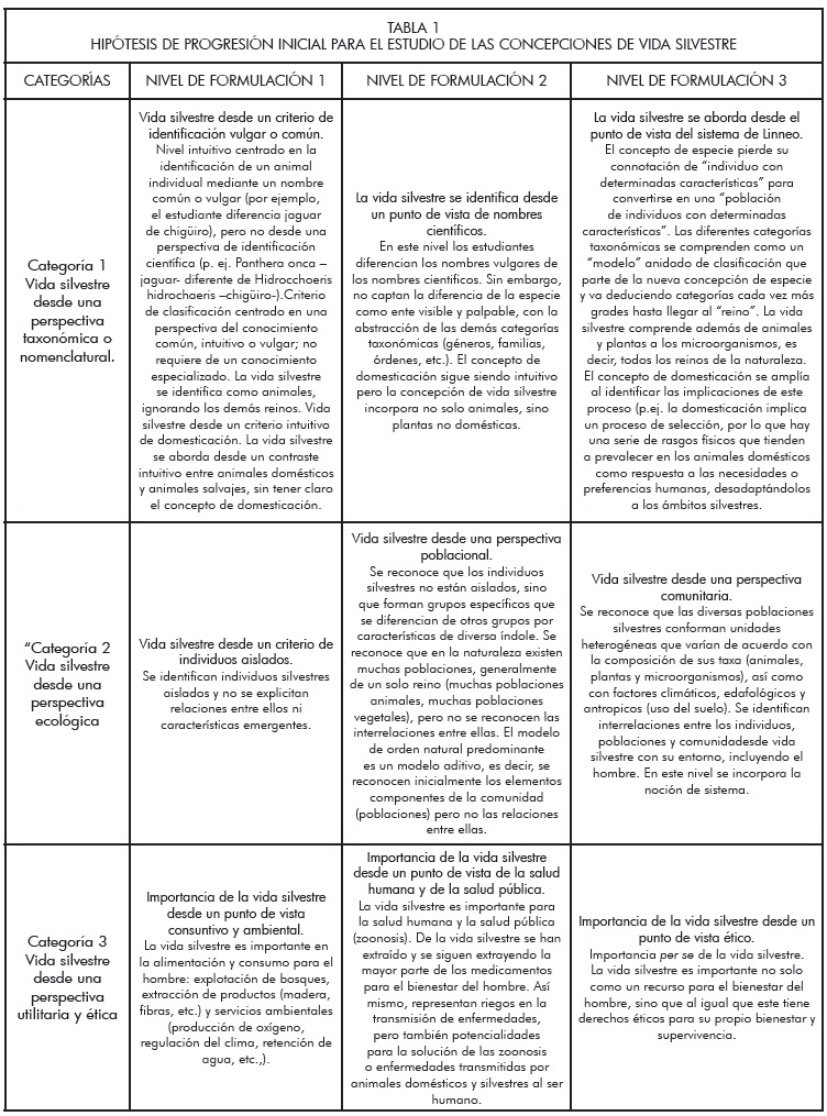 Para la construcción de la hipótesis de progresión se procedió de la siguiente manera: 1) Se realizó una revisión histórica del concepto de vida silvestre, complementándose con una exploración y análisis bibliográfico referido a la educación en vida silvestre, la investigación en educación sobre la vida silvestre, la "importancia de la vida silvestre (Rubiano, 2011), además de una revisión de textos universitarios de ecología y la realización de entrevistas a investigadores en ciencias puras y ciencias de la educación. 2) Se tomó como referencia específica el programa del curso Percepción y apreciación de la vida silvestre2, con el fin de acotar la extensa bibliografía encontrada. 3) Con esta información se establecieron las categorías de investigación que finalmente dieron origen a la hipótesis de progresión. Al analizar la bibliografía surgieron varias perspectivas o modos de concebir la vida silvestre: perspectivas históricas, biológicas, taxonómicas, ecológicas, de educación ambiental, utilitarias y éticas. Entre ellas seleccionamos las perspectivas taxonómica, ecológica, de utilidad y de derechos éticos, debido a la importancia que se les concede en las prácticas y talleres del curso. Dichas perspectivas corresponden a su vez a las categorías en que podemos subdividir la amplia temática de la vida silvestre. Ellas son: