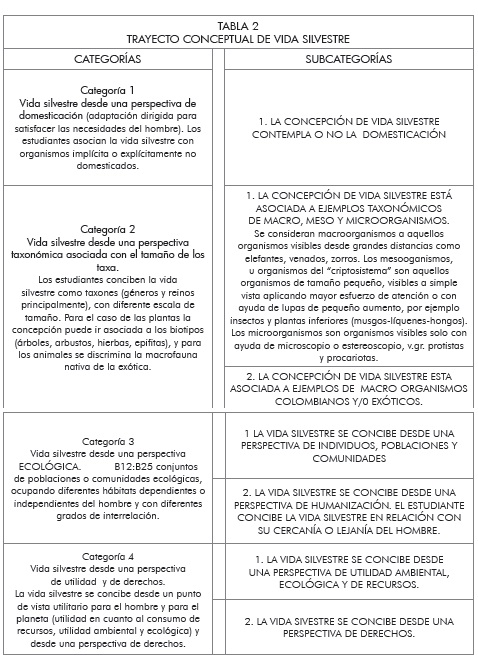 De acuerdo con la metodología descrita, se plantearon tres categorías o maneras de concebir la vida silvestre (Tabla 1): Vida silvestre desde una perspectiva taxonómica o nomenclatural, Vida silvestre desde una perspectiva ecológica, y Vida silvestre desde una perspectiva utilitaria y ética. Los contenidos de cada una de ellas se ajustaron a parámetros teóricos pertinentes (v.gr. García, 1994, 1999, García y Carmona, 1991), la revisión de la concepción (Rubiano 2011), programas y textos universitarios v.gr. programas de taxonomía y de ecología de la Universidad Nacional de Colombia, textos universitarios de ecología y al programa del curso "Percepción y apreciación de vida silvestre".