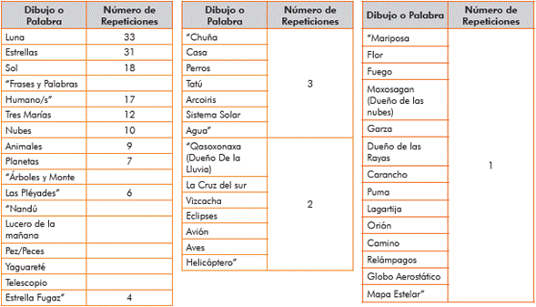 Figura 4 Dibujos obtenidos en el primer ciclo de investigación, en ellos aparecen las Pléyades o Siete Cabritas, las Tres Marías, un ñandú (Mañik) y un tatú carreta.