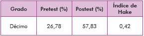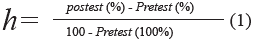 Para evaluar la efectividad de la estrategia, se trabajó con el factor de Hake (Hake, 1998) o ganancia relativa de aprendizaje conceptual, esta cantidad indica la ganancia promedio del aprendizaje conceptual y permite comparar el grado de logro de la estrategia educativa, en la ecuación 1 se presenta cómo se calcula el factor de Hake: