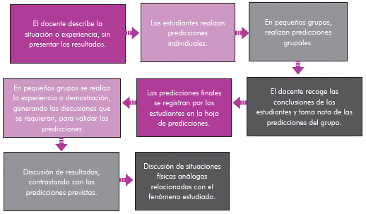 La MAA propuesta por Thornton y Sokoloff (1997), contempla ocho pasos para su implementación en el aula, los cuales están descritos en la figura 1. Para la estrategia en el aula existen dos variantes que pueden ayudar en su realización, clases interactivas demostrativas (CID) o laboratorios de aprendizaje activo (LAA) (Sokoloff y Thornton, 2004).