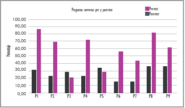 En la siguiente figura se relacionan los resultados correctos por pregunta, para el pretest y postest; en la tabla 4 se presenta el índice o factor de Hake (ganancia de aprendizaje global).