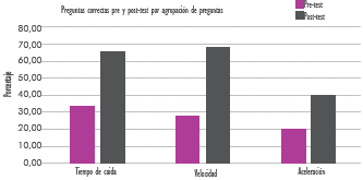 De estas figuras y tablas se puede concluir que en cuanto al tiempo de caída se tuvo un buen nivel de asimilación (rango medio de ganancia de aprendizaje), que se puede atribuir de las situaciones físicas ejecutadas durante la unidad didáctica, así como la discusión de resultados y contrastación de predicciones; para la variable de velocidad se presentó una ganancia relativa de aprendizaje media. En relación con la aceleración, la ganancia relativa de aprendizaje es baja, los estudiantes tienen dificultades para asociar que en el movimiento de caída libre o lanzamiento vertical hacia arriba el cambio de la velocidad en función del tiempo es proporcional y que este hecho está relacionado con la aceleración constante. Se hace necesario implementar más situaciones experimentales que posibiliten mayor apropiación conceptual, en donde se analicen las variables físicas que intervienen; por ejemplo, disponer de esferas de poliestireno del mismo tamaño, hacerles hueco y rellenarlas de diferentes materiales, de tal forma que queden unas más pesadas que otras, dejar caer dos a dos las esferas, indagar a los alumnos por cuál llegará primero al suelo y por qué, realizar la práctica y discutir los resultados, repetir la situación, haciendo uso de celulares para grabar la caída de los cuerpos, y con ayuda de videotracker realizar el análisis de variables, enfatizando en la aceleración del movimiento.