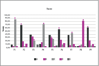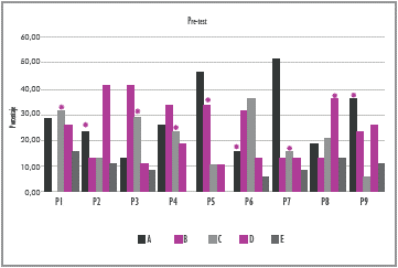 En la figura 2, en el eje de las abscisas se grafican las nueve preguntas realizadas a los estudiantes en cada una de las cinco opciones de respuesta y en el eje de las ordenadas el porcentaje obtenido por los estudiantes en cada una de ellas. La opción de respuesta correcta está señalada con un asterisco amarillo.