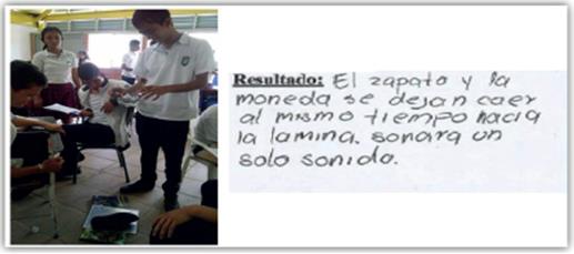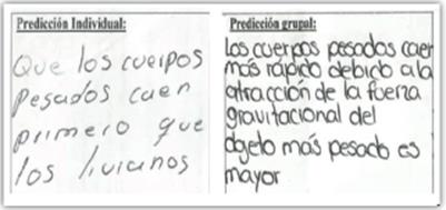 En la figura 5 se presenta un ejemplo de las predicciones de los estudiantes frente a la situación de la secuencia dos, en la que se observa que los estudiantes van modificando sus concepciones previas asociadas con la caída de los cuerpos.
