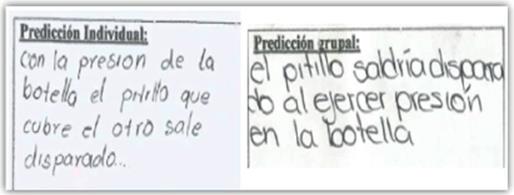 En la figura 7 se presenta un ejemplo de las predicciones individuales relacionadas con la situación planteada en la tercera secuencia; los estudiantes predicen lo que consideran que va a suceder, sin embargo, no hablan de movimiento vertical hacia arriba, ni de cambios en la velocidad en función del ascenso del pitillo.