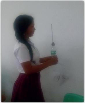 En la figura 4 se presenta un estudiante realizando la demostración o diseño experimental; trabajaron en pequeños grupos, los mismos que se conformaron para las predicciones grupales, realizaron la práctica tantas veces como fue necesario, obteniendo sus propios resultados, para comparar luego con las predicciones y argumentar sus hallazgos.