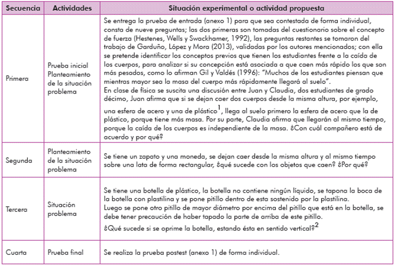Para el desarrollo de la experiencia, en primer lugar, se planeó la unidad didáctica (UD); para ello se tuvo en cuenta la malla curricular de la Institución Educativa Emiliano Restrepo Echavarría, institución de carácter oficial del municipio de Restrepo (Meta). Se trabajó con una muestra de 39 estudiantes de grado 10-1 (año lectivo 2016), se diseñó para ser ejecutada en cuatro intervenciones; posteriormente, se implementó la UD, de manera simultánea se hizo la observación y la reflexión, de tal forma que si era preciso realizar ajustes al diseño de la UD para lograr el propósito, se hicieran. En la tabla 1 se presentan las situaciones propuestas que permitieron abordar la temática de caída libre.