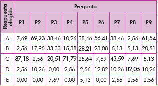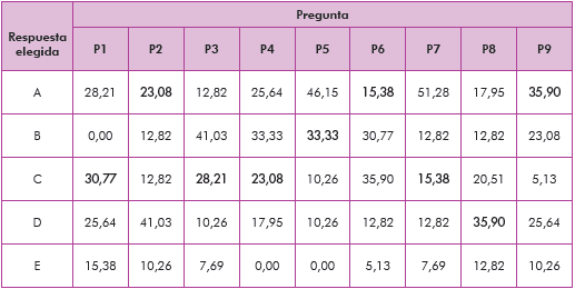 Finalmente se aplica el postest para evaluar qué sucedió con las ideas previas de los estudiantes luego de las intervenciones; en la tabla 3 se presentan los porcentajes de estudiantes que seleccionaron cada una de las cinco opciones de respuesta para las nueve preguntas de la prueba. El porcentaje de la respuesta correcta está señalado en negrita.