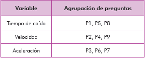 Para una mejor comprensión, se clasificaron las preguntas en tres grupos o variables, atendiendo a los conceptos que evalúa. La agrupación de preguntas se ilustra en la tabla 5.