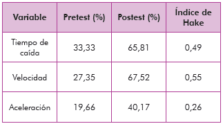 La ganancia de aprendizaje, según el índice de Hake, se clasifica en el rango medio entre 0,3 y 0,7. Se observa un avance significativo en la comprensión del movimiento en caída libre.