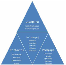 El modelo del CDC elaborado por Vázquez y Manassero (2015) es más sencillo y resalta la idea original de Shulman (1986) sobre la amalgama de distintos conocimientos. El CDC se representa en el centro de un triángulo (Véase figura 1), como fusión de los conceptos representados en los tres vértices, a saber: conocimientos disciplinares (sustancia y sintaxis), conocimientos pedagógicos (instrucción, gestión, objetivos, currículo, evaluación, aprendizaje) y conocimiento de contextos educativos (estudiantes, escuelas, sociedad).