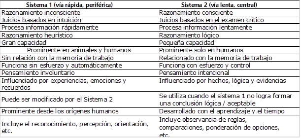 Hoy en día existe un consenso básico acerca de la existencia de dos vías fundamentales a través de las cuales los humanos procesamos la información, que después se transforma en aprendizaje. Según el premio Nobel Daniel Kahneman (2012), la mente procede a través de dos modos de pensamiento básicos, paralelos, superpuestos e interactivos, que denomina sistema 1 (rápido) y sistema 2 (lento), y que otros autores denominan vía periférica o rápida, y vía central o profunda (Véase tabla 1). Desde el punto de vista neurológico, el rasgo más importante es que la vía rápida no utiliza la memoria de trabajo (largo plazo), mientras la vía central recurre a la memoria de trabajo.