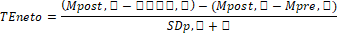 En el presente estudio, se llevó a cabo el cálculo del TE desde dos perspectivas con el fin de valorar la eficacia de la intervención en mayor profundidad. Por un lado, para valorar individualmente la magnitud del progreso experimentado dentro de cada grupo (control y experimental), para cada uno, se realizó la medida de las diferencias de puntuación obtenidas en el pre-test y post-test, dividida entre la desviación estándar ponderada de ambos (figura 1):